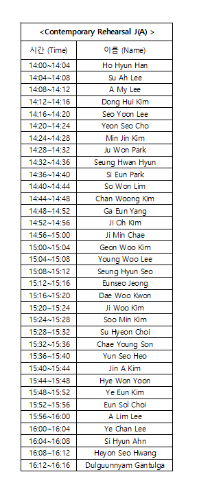 안녕하세요 코리아국제발레콩쿠르 사무국입니다주니어 A부문 세미파이널 리허설 시간을 공지드립니다.1. 참가자별로 공지된 리허설 시간 15분전까지 계당홀 로비를 통해 무대 하수쪽에서 대기해 주시기 바랍니다. 2. 공지된 리허설 시간에만 무대 사용이 가능하오니 이점 꼭 숙지하여 재시간에 와주시기 바랍니다.3. 참가자 외 1명만 무대 입장이 가능합니다.